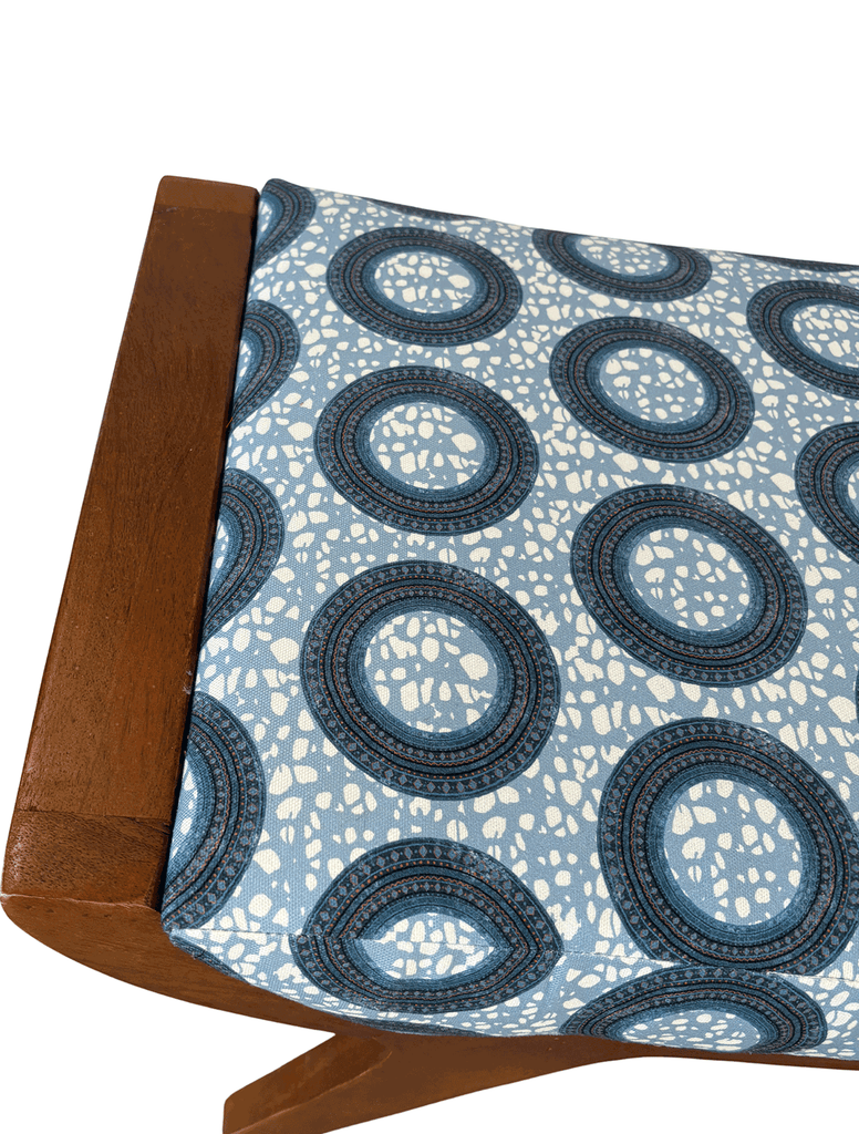 Upholstered in Eva Sonaike’s Ayo Blue fabric, with its circular motif symbolising joy and harmony, this bench brings calm energy and refined colour to any space. The smooth teak wood frame adds warmth and sophistication, making it both functional and full of character.